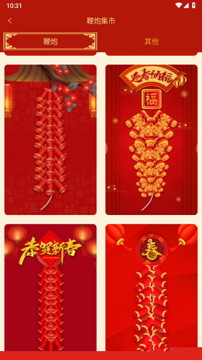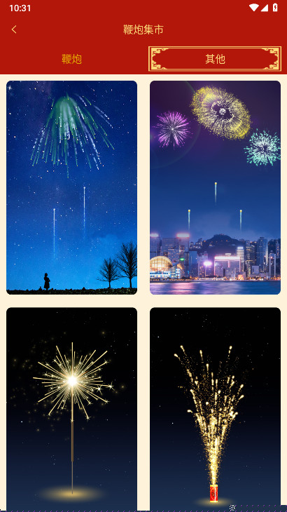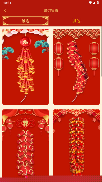 通过中央房屋图标进入主题库,滑动浏览不同风格的鞭炮类型与场景皮肤。