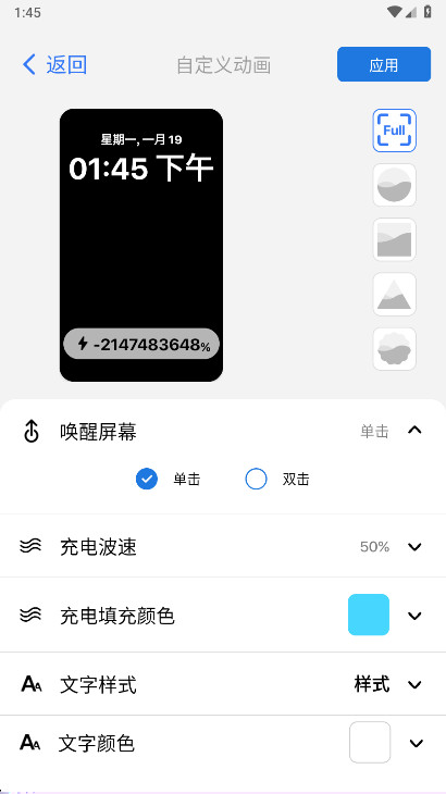 在特效与动画或类似设置分类中,找到充电特效选项。进入后可以选择预设的多种动画样式,并预览效果,选择后即可生效。