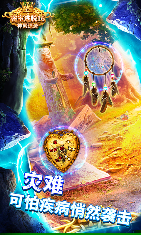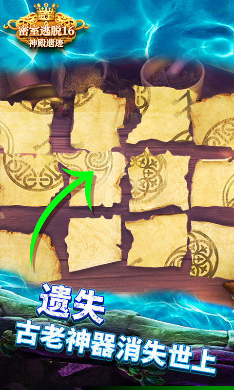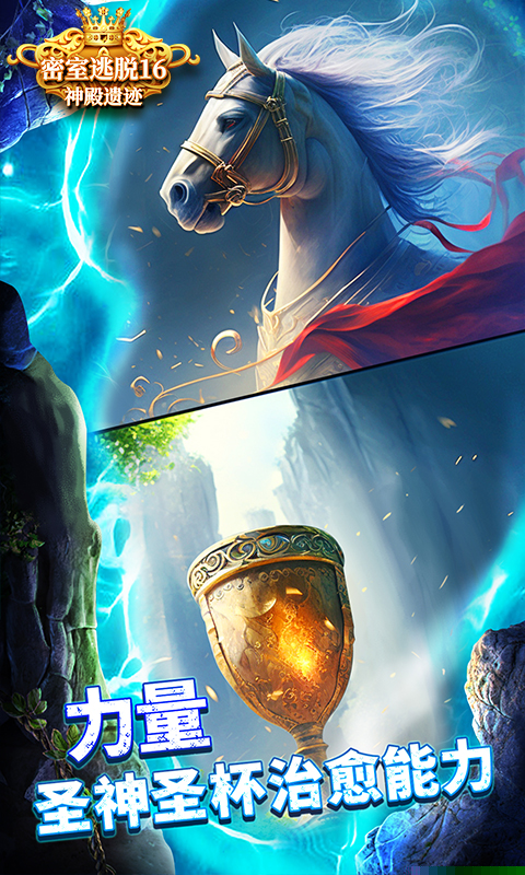 密室逃脱16神殿遗迹是一款以亚瑟王传说为背景的解谜冒险作品,将扮演一位勇敢的探险者,为拯救身患重病的吉尼维尔女王,踏上寻找传说中圣杯的艰险旅程。故事从一位老巫师的神秘指引开始,引领你进入藏有三扇黑暗之门的洞穴,穿越三个截然不同的奇幻世界,通过合成道具、破解机关与收集线索,克服重重阻碍,最终揭开圣杯的秘密。