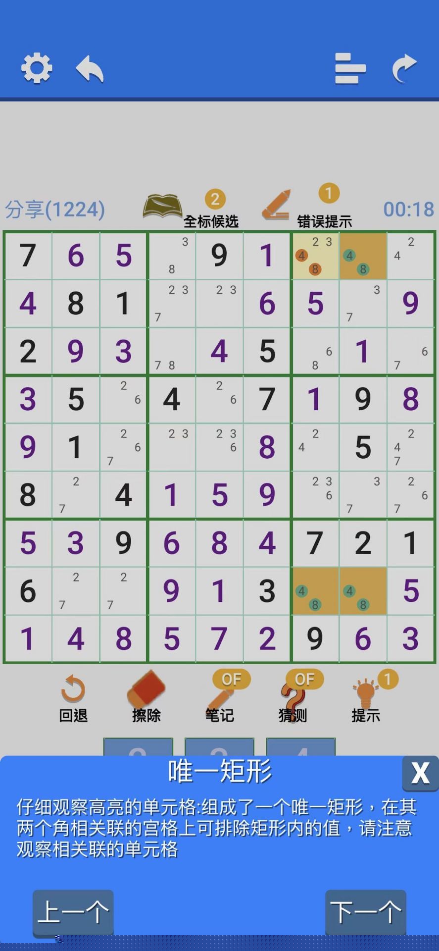 面对中高阶谜题时,需综合运用唯余数、宫摒除等技巧,逐步缩小候选数范围,构建清晰的推理路径。