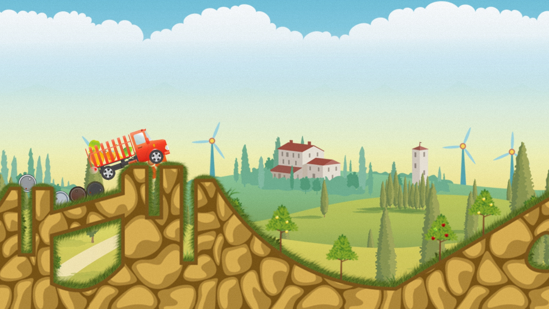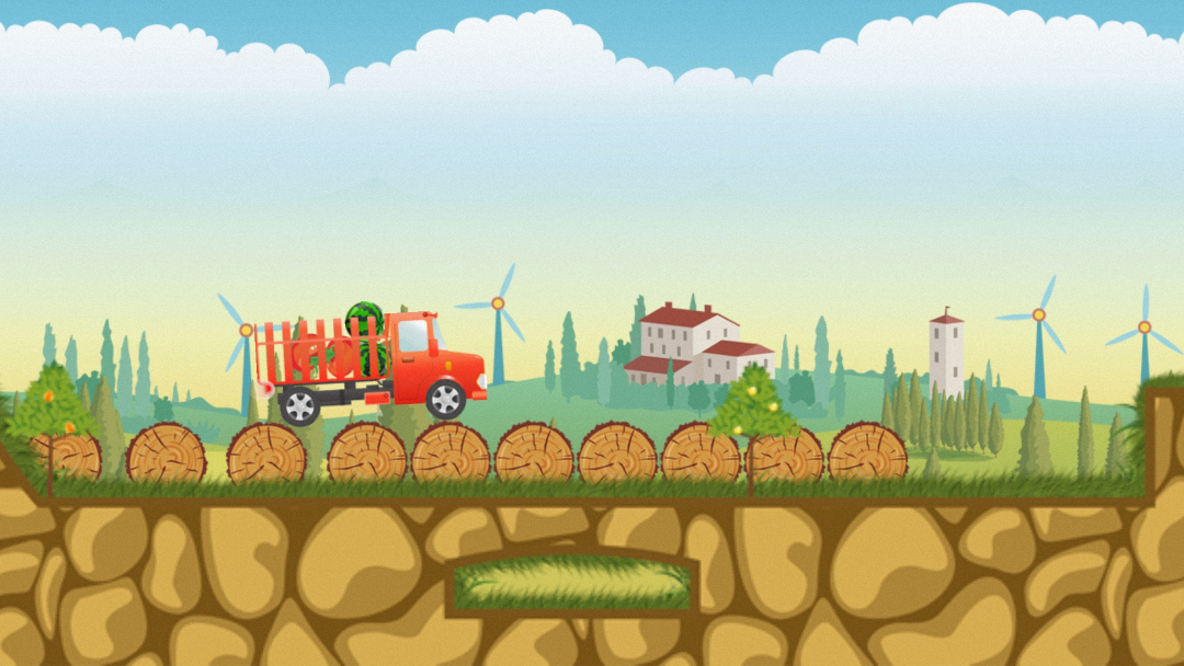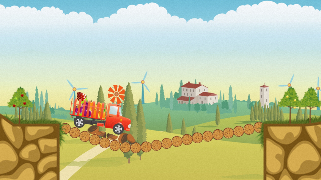 操控卡车移动,收集水果。遇到沟壑或高台时,可将场景中的木块、滚木推至合适位置,搭建临时桥梁或垫脚石。