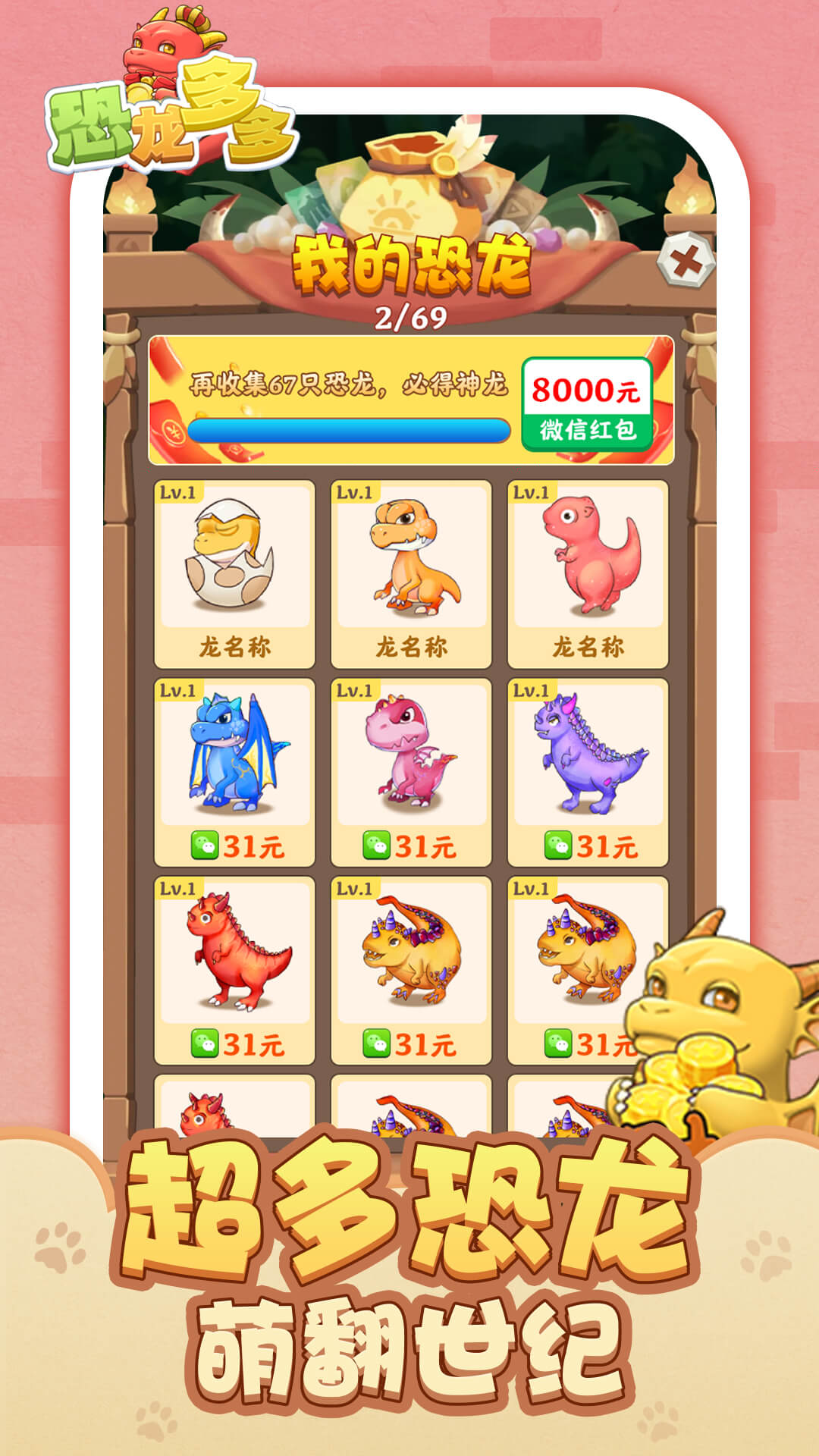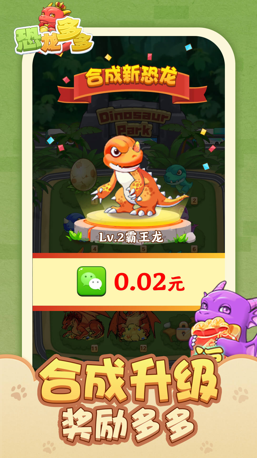 恐龙多多是一款轻松有趣的合成赚钱小游戏,将两个同样的小恐龙拖拽到一起就可以升级并获得红包奖励!集齐福禄寿喜财五福龙还能领取超级奖励,超多恐龙等你来发现~